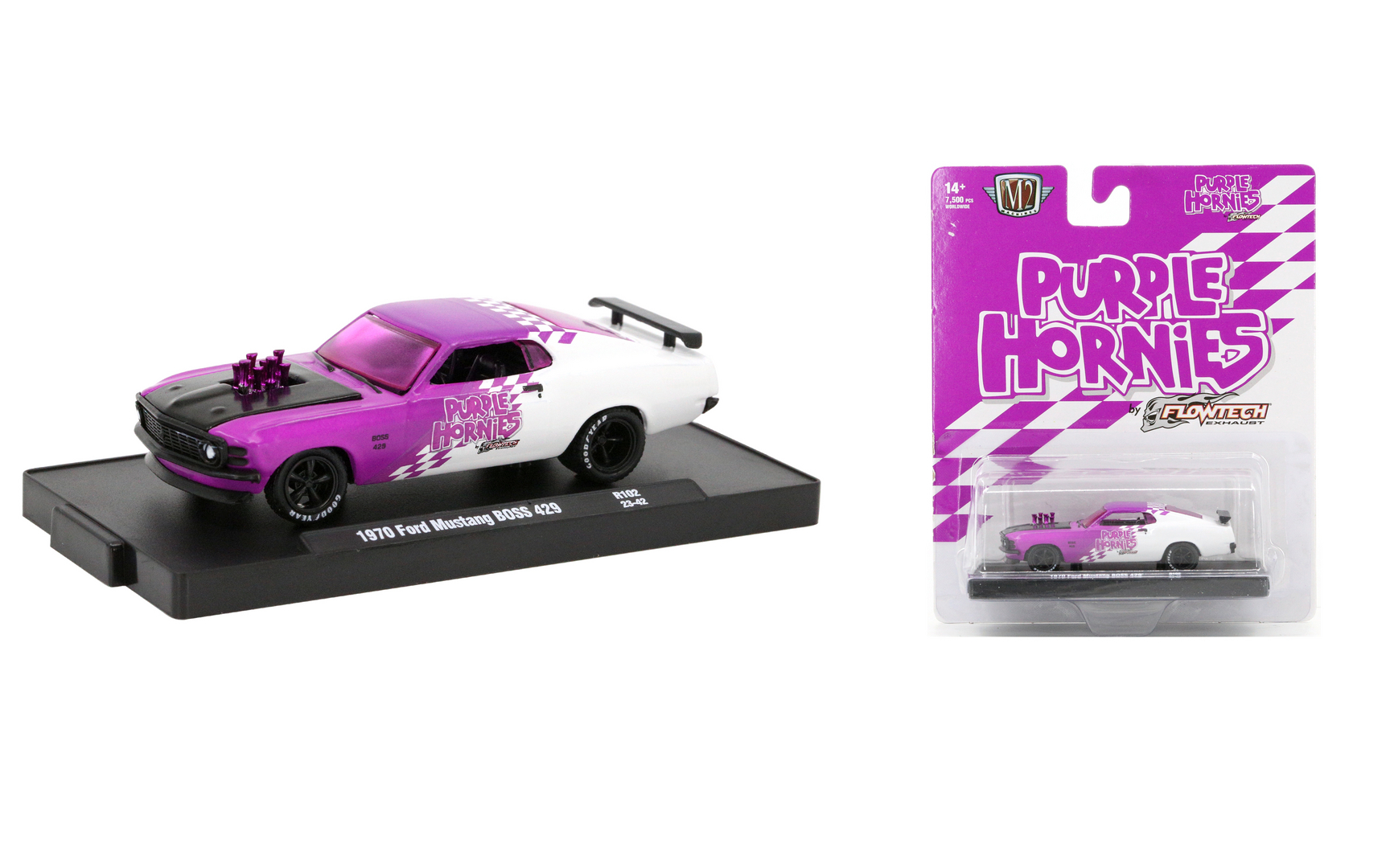 M2 – 1:64 – Auto-Drivers – Release 102 – 1970 Ford Mustang BOSS 429 (Purple Hornies/Flowtech Exhaust)