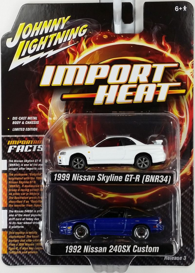 Johnny Lightning – 1:64 – Import Heat – 2018 Themed 2-Pack – 1999 Nissan Skyline GT-R (BNR34) – White/1992 Nissan 240SX Custom – Blue