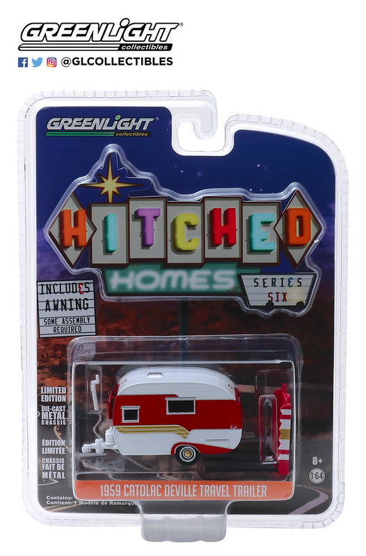 GreenLight – 1:64 – Hitched Homes – Series 6 – 1959 Catolac DeVille Travel Trailer – Red and Gold with Awning
