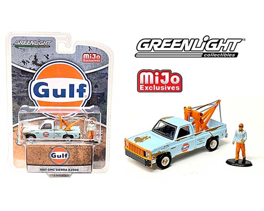 GreenLight – 1:64 – 1987 GMC Sierra K2500 – Tow Truck – Weathered with Figure – GULF – (MiJo Exclusive)