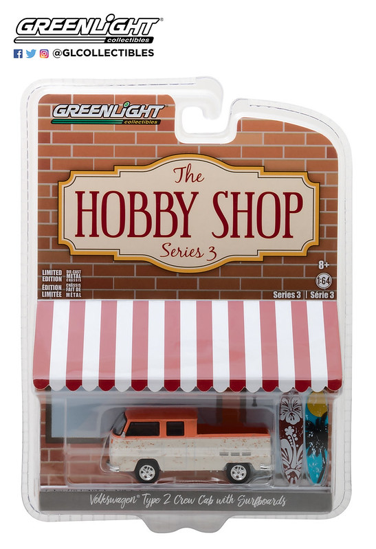 GreenLight – 1:64 – The Hobby Shop – Series 3 – Volkswagen Type 2 Crew Cab Pick-Up “Doka” with Surfboard